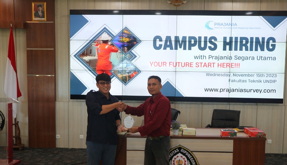 The event commenced with a speech by Dr. L M Sabri, who is the Head of the Department of Geodetic Engineering and also serves as the Chair of the Undergraduate Program in Geodetic Engineering at the Faculty of Engineering, UNDIP. During his speech, Dr. Sabri shared his experience of boarding the Baruna Jaya I ship for a hydrographic survey in 2019 north of Papua in an effort to expand Indonesia’s Continental Shelf. He emphasized the importance of physical readiness, mental health, discipline, and responsibility for optimal work at sea. In his closing remarks, he expressed his utmost gratitude and appreciation for PT. Prajania Segara Utama’s willingness to conduct campus hiring for the program’s alumni, including fresh graduates.